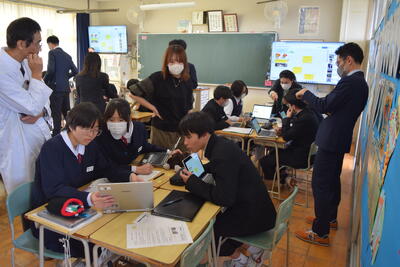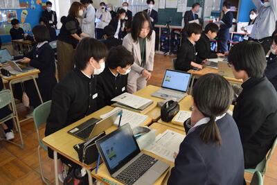 12月2日(火)4時間目、3年1組においてAI実証授業(家庭科)が行われました。この事業は、文科省委託でTBSや東京書籍、TOPPANなどの企業が、次期学習指導要領を見据え、「AIソフトを開発」し、探究型の授業を推進することを目的にしたものです。本授業テーマは、「中学生の力を地域に届けよう!~行田市しあわせ創造プロジェクト」です。生徒は、初めてのAIソフトを使いながら、テーマに真剣に取り組んでいました。